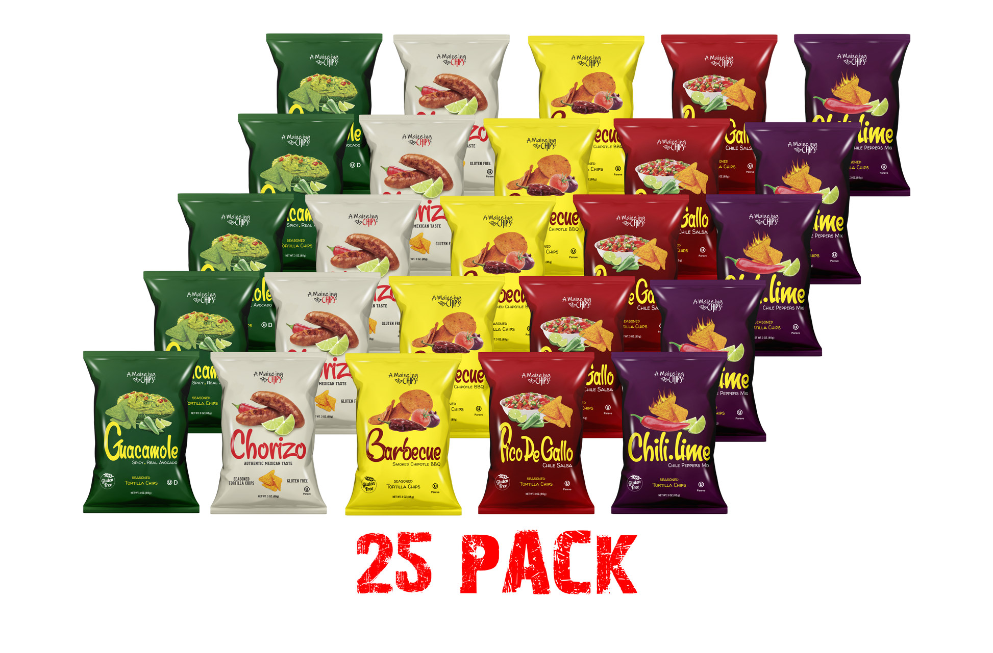 A-Maize-ing Chips Party Packs brings all the flavors together to satisfy everyone's taste. These chips are made from 100% white corn and pack a punch of flavor. Each Party Pack will include an assortment of Guacamole, Pico de Gallo, Chili-Lime, Chorizo and Chipotle BBQ flavors. Available in 10, 15. 20 or 25 count boxes and each bag is a single serving 1.5oz bag. The flavors will be equally split per the box count.